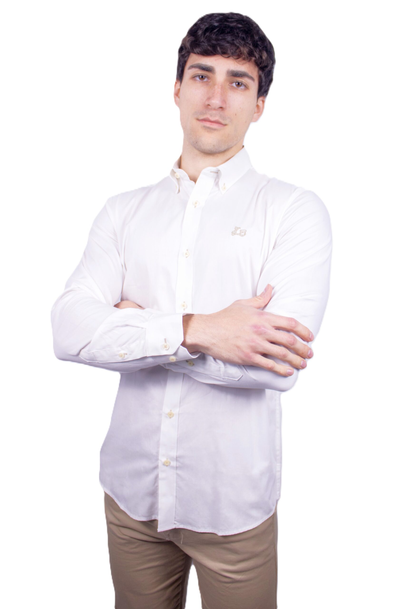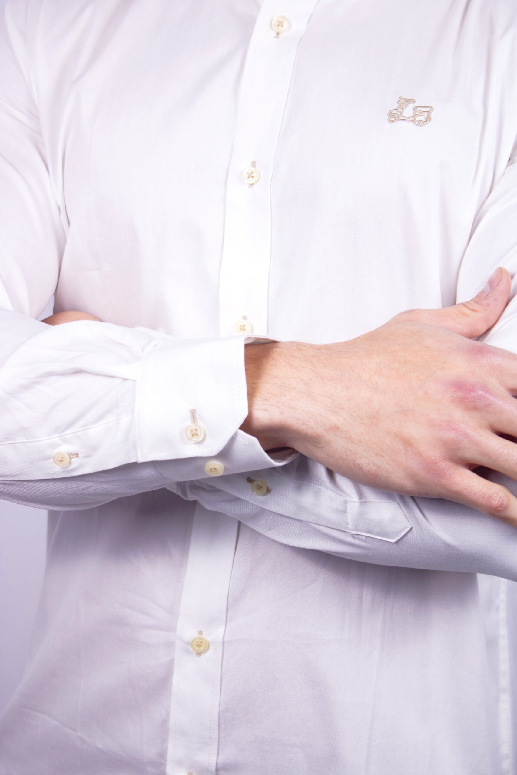 Camisa blanca. Manga Larga. Compuesta de 100% algodón y corte semientallado. Cuello con botón.