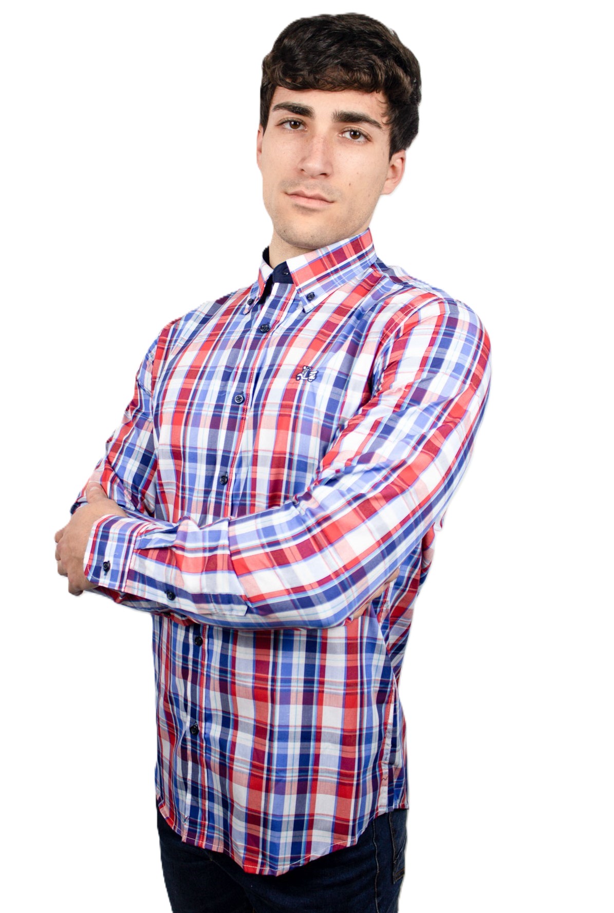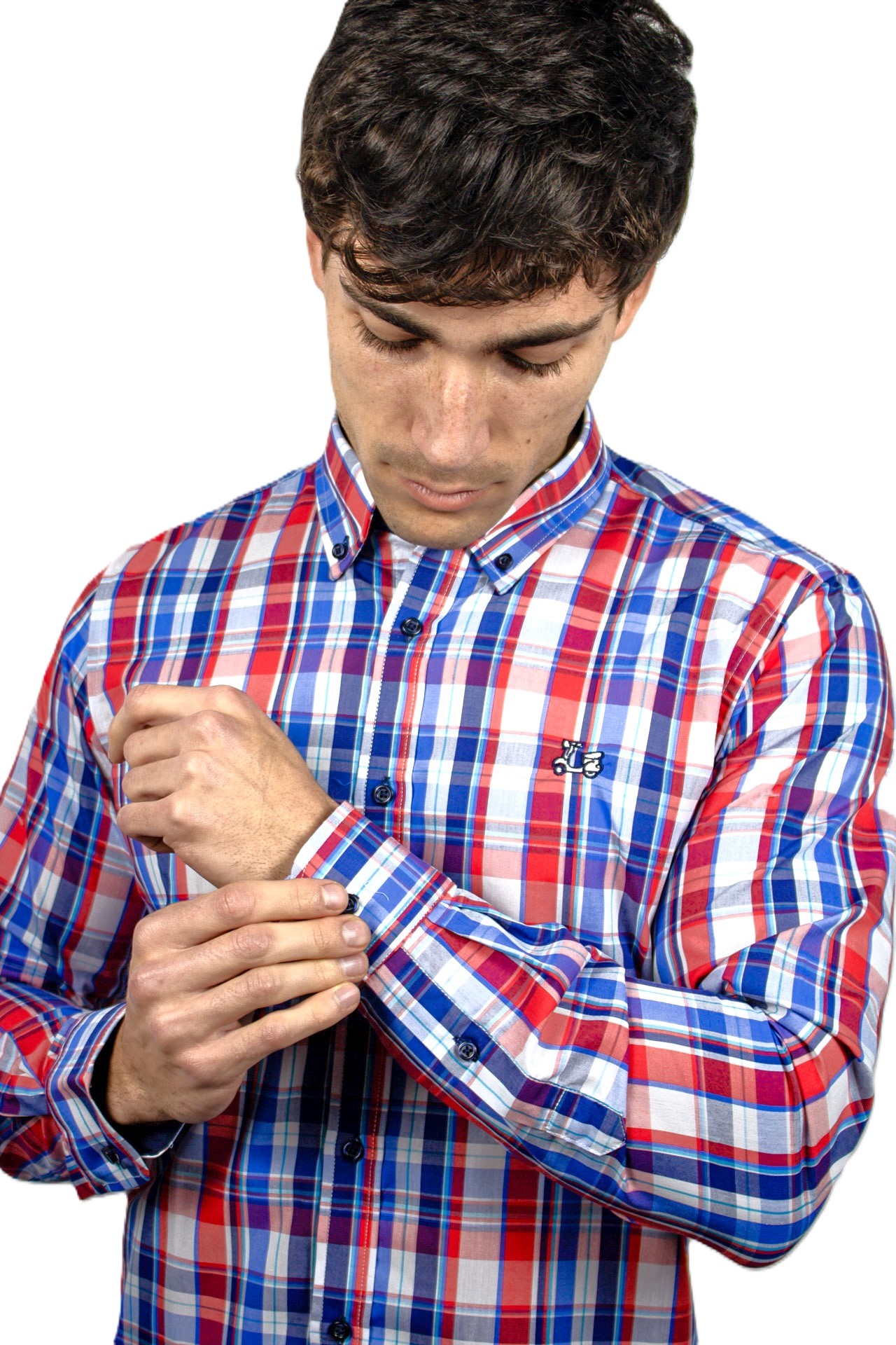 Camisa de cuadros. Compuesta de mezcla de algodón de corte Regular fit. Presenta diseño de cuello button-down, manga larga con puño abotonado y cierre frontal con botones personalizados. Cuenta con un bordado de moto Ridebike en pecho.