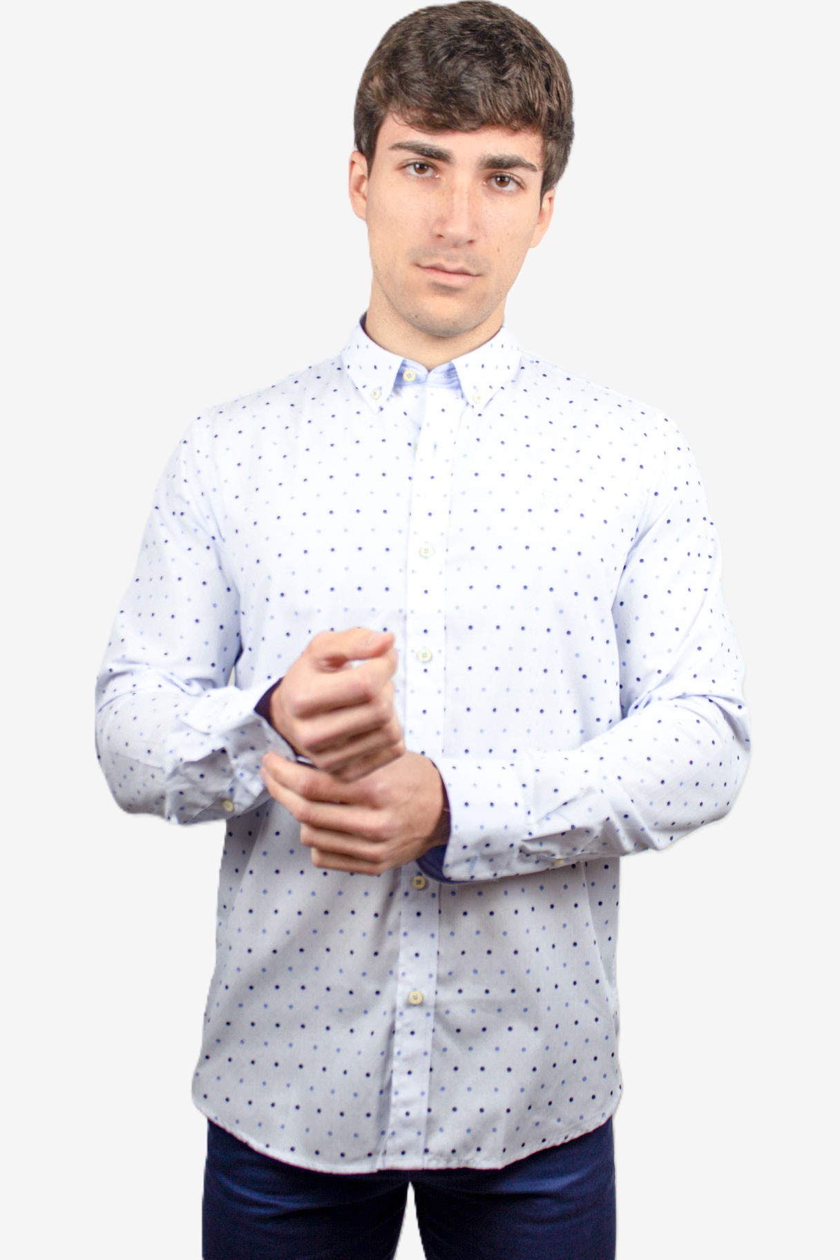 Camisa milrayas celeste con estampado de topitos azules. Compuesta de mezcla de algodón de corte Regular fit.