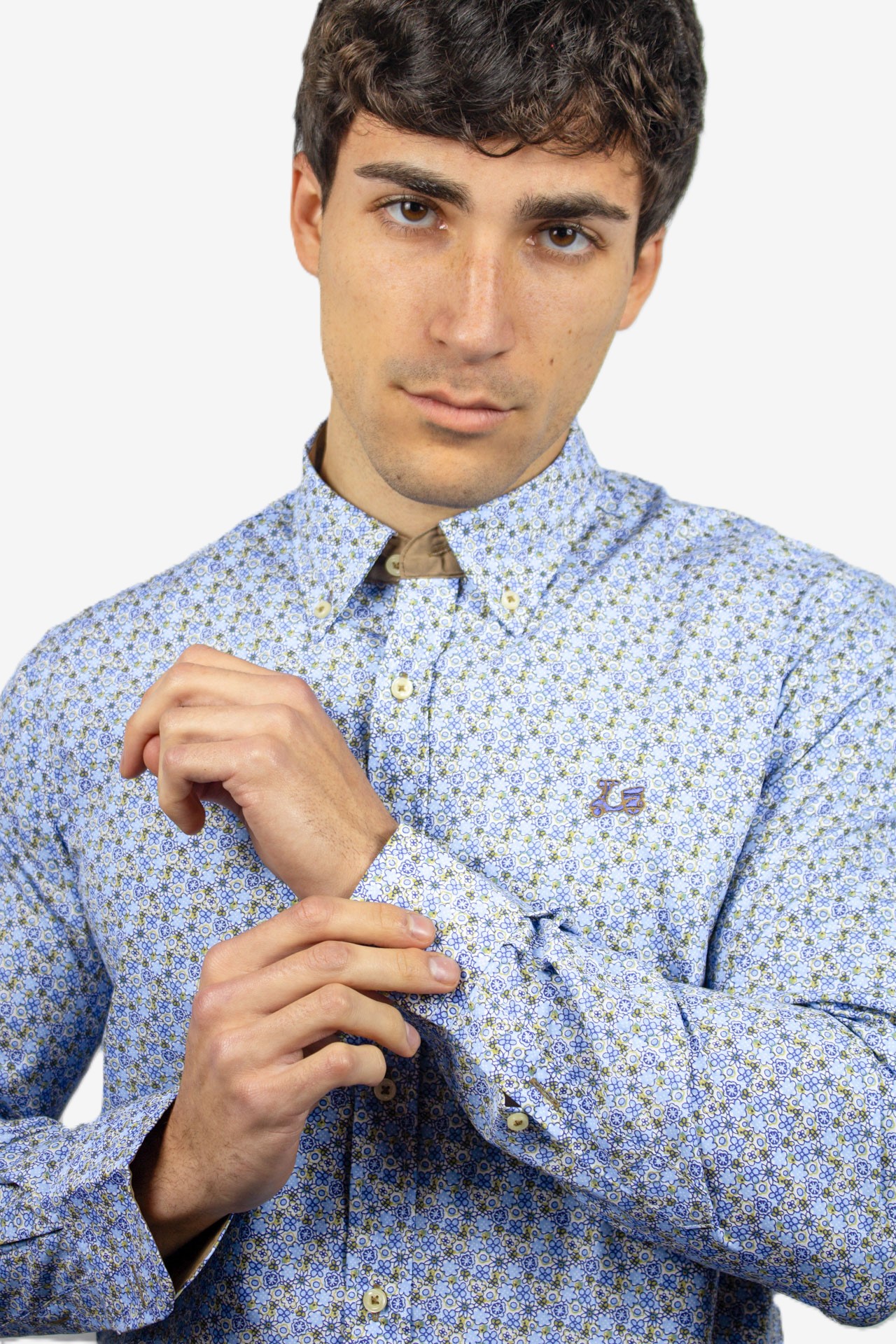 Camisa con estampado floral azul. Manga Larga. Compuesta de 65% algodón y corte semientallado. Cuello con botón.
