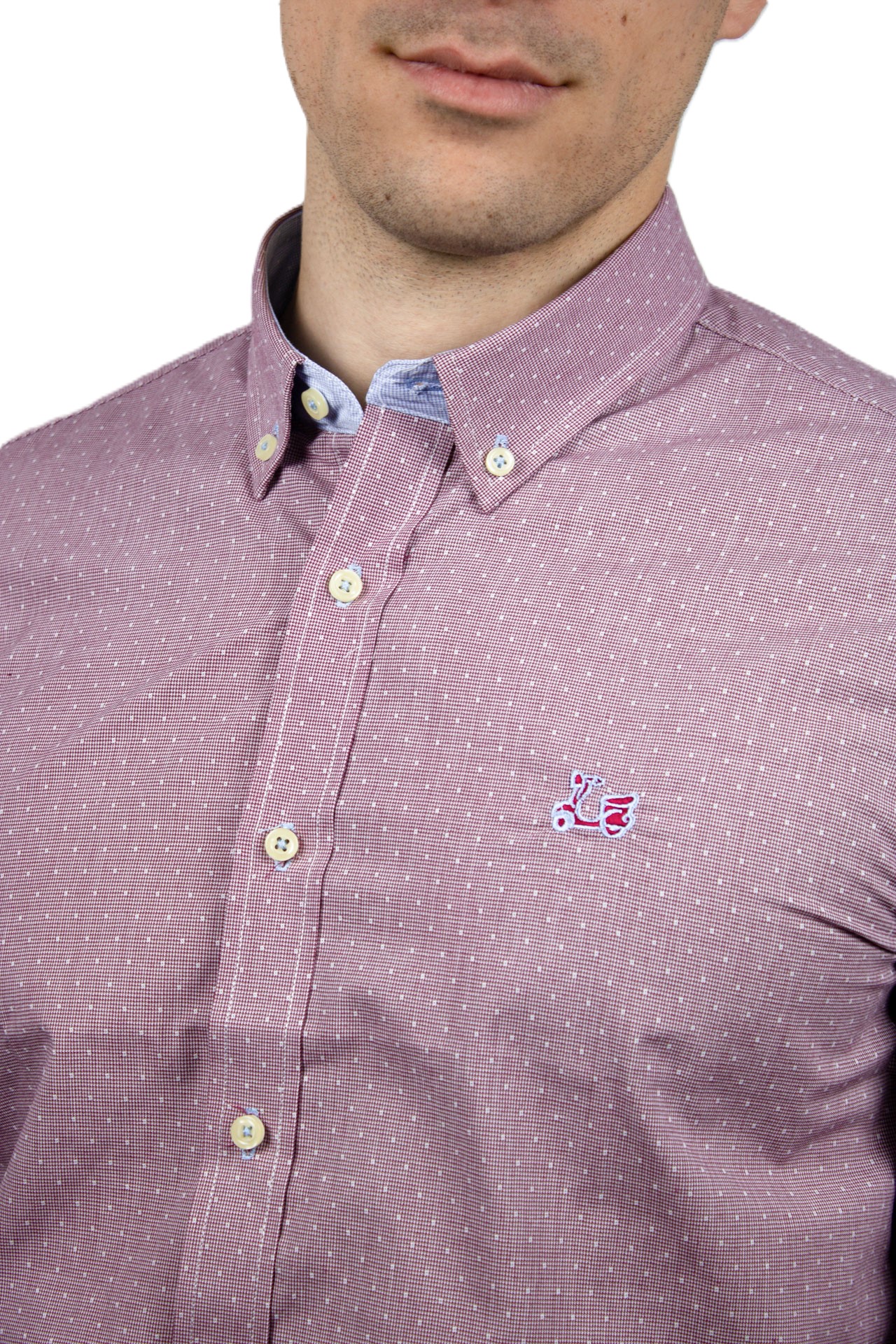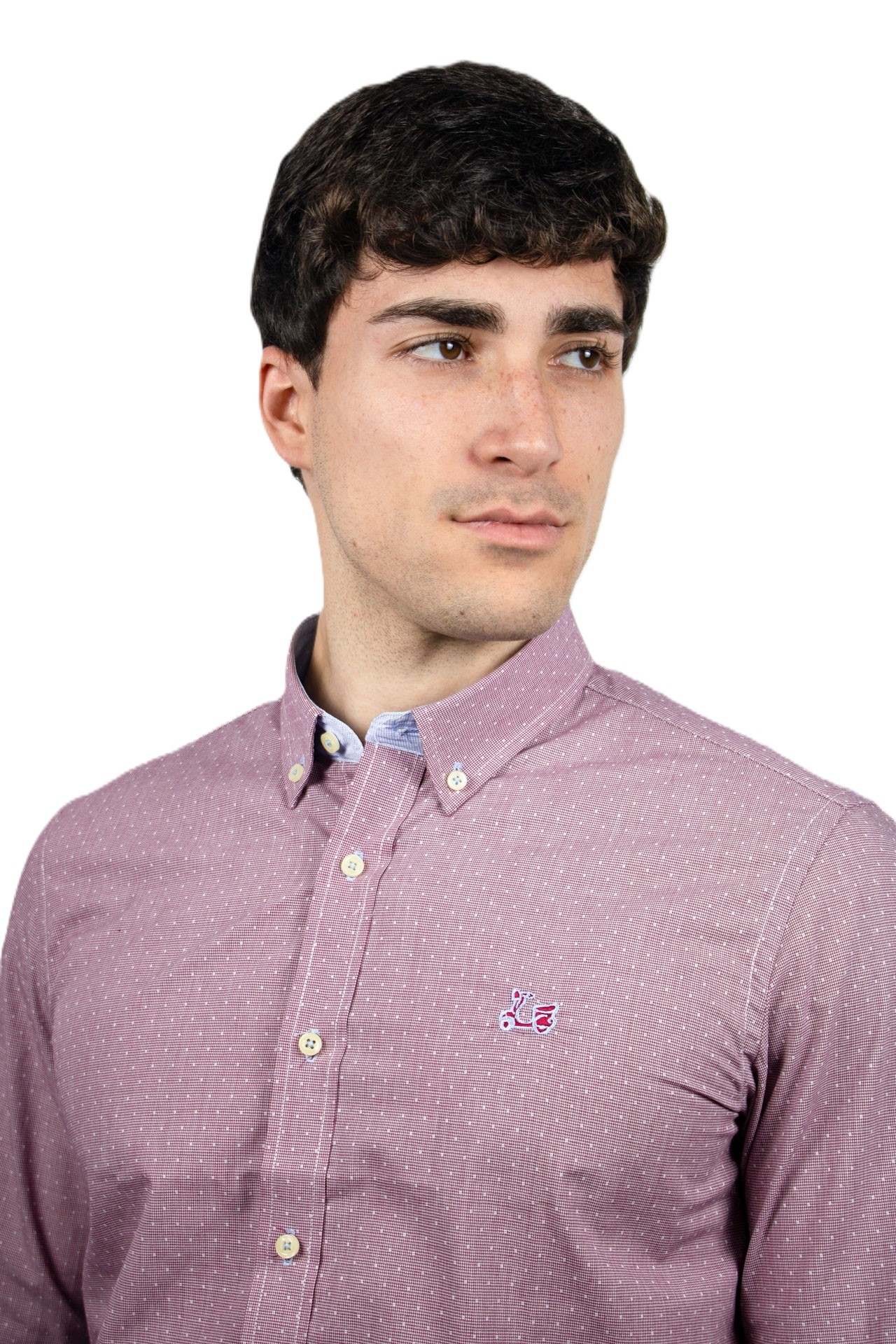 Camisa diseño pata de gallo en burdeos. Combinación pata de gallo celeste en interior de puño y cuello. Corte semientallado. Manga larga. Logotipo de vespita bordado en pecho. Cuello con botón y el puño con cierre de dos botones.